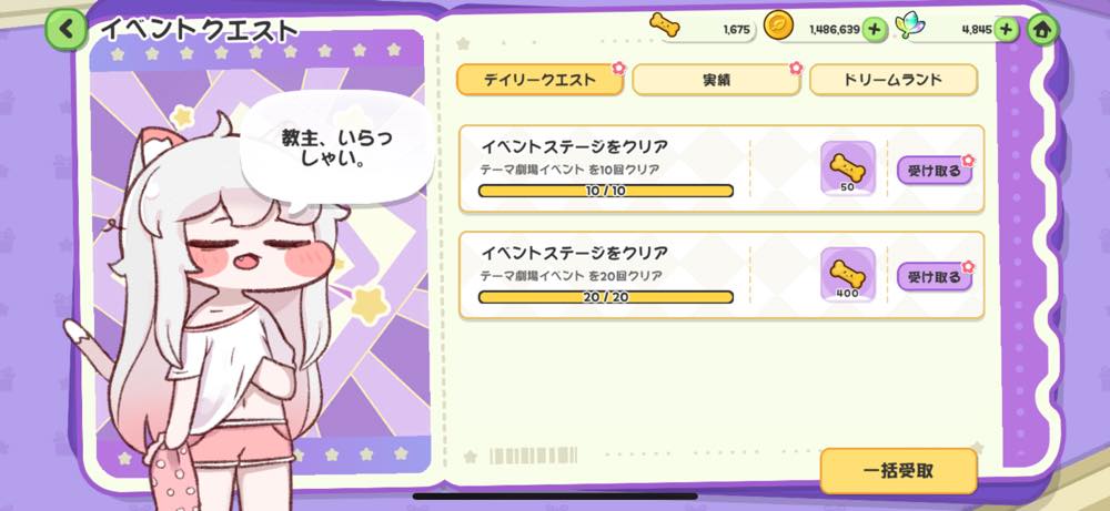デイリークエストで「イベント20回クリア」すると報酬がもらえるので毎日やりましょう