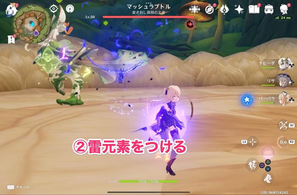 | ① | ![]() パーティ編成 ・草キャラ1人 ・雷キャラ1〜2人 ・回復かシールドキャラ1人 倒さないためになるべく弱いキャラクターでいこう |