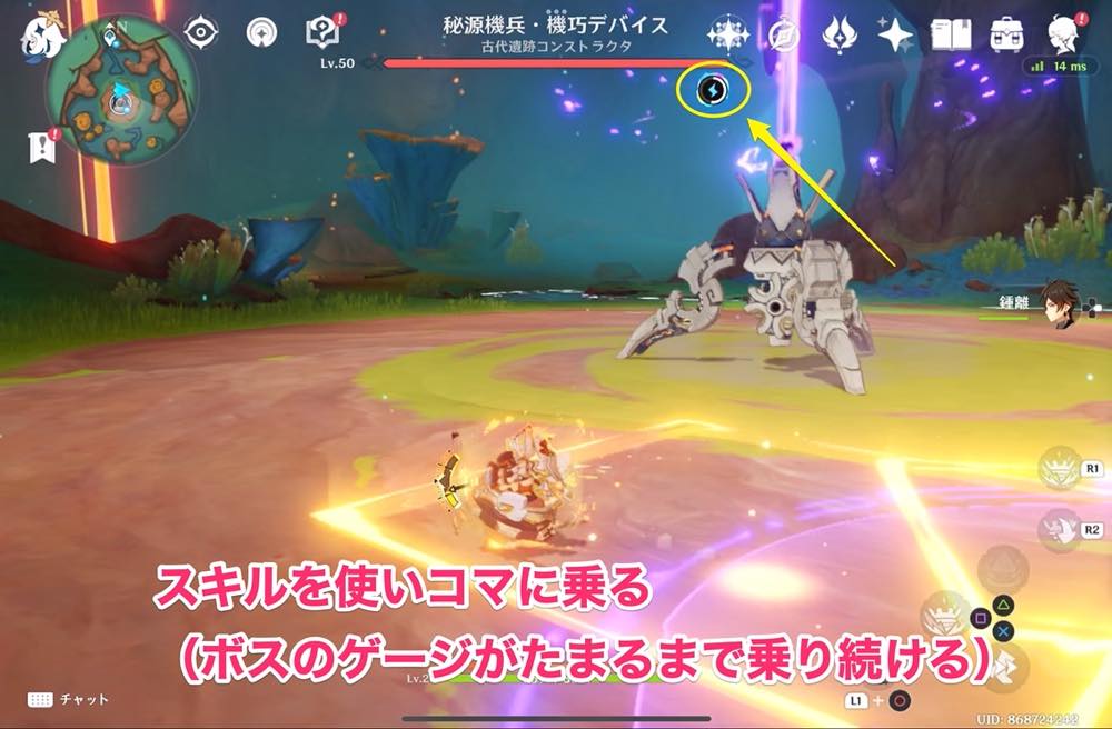 | ⑤ | ![]() カチーナ → スキル(長押しか短押し2回)を使いコマに乗る ボスのゲージがたまるまで乗ったままにしよう |