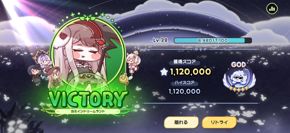 トリッカルの期間限定イベント ドリームランドでスコア100万取る方法 について紹介しています モモとジュビーを入れたパーティ 「祝福の記憶」と「雨粒の記憶」を選びます・雨 → 攻撃のため・祝福 → HP増加で安定 ヨミ、シオン、リム、ポーシャー、モモ...
