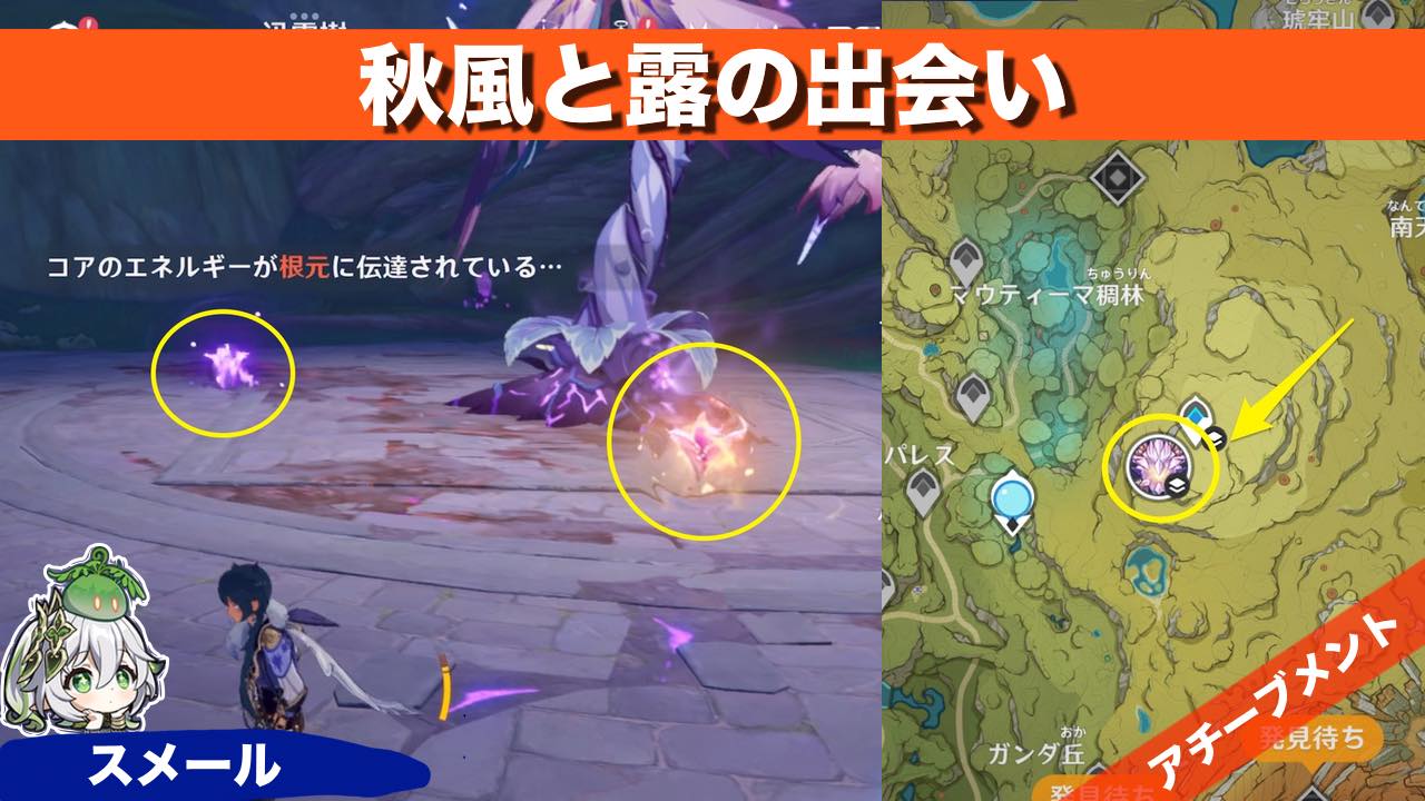 原神のアチーブメント 秋風と露の出会い の獲得方法を紹介しています 情報 全体図 場所スメール・迅電樹発生条件なしクリア時間3分アチーブメント秋風と露の出会いアチーブメント取り方迅電樹が放った電荷を互いに衝突させる(攻撃せずに待機しているだけ... -